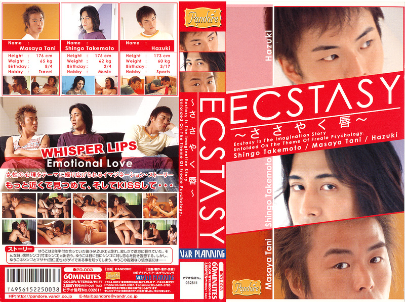 「女性の性の解放の為にできる事は何か?」というコンセプトの元に立ち上げられたレーベル『PANDORE(パンドル)』。そのパンドルが女性の為のAVとして制作したのが「ECSTASY」シリーズ。今回は前作とは少し趣向を変え、女性の心理をテーマに繰り広げられる。3人の男(竹本シンゴ、 田仁正也、 葉月)と1人の女が複雑に絡み合うイマジネーション・ストーリー。ゆうこは付き合っていた彼氏と別れ、寂しさで途方に暮れていた。そんな時、偶然シンゴと出会う。ゆうこは日に日にシンゴに対し恋心を抱き妄想する。しかし、ゆうこはシンゴとマサヤがゲイである事を知ってしまう。ゆうこの複雑な心境の裏には・・・。 / ECSTASY~ささやく唇~